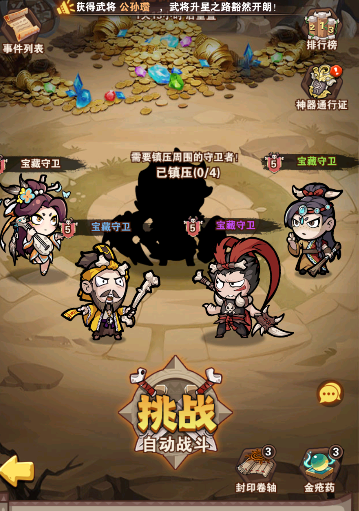 2,寻龙探宝,探宝可获取神器碎片和神器锻造石还有天宫石,该模式建议上阵比较强力的角色去闯关,闯关越多获取的材料越多,(有能力的可以把神器通行证购买)卡关的时候可以使用封印卷轴闯到下一关