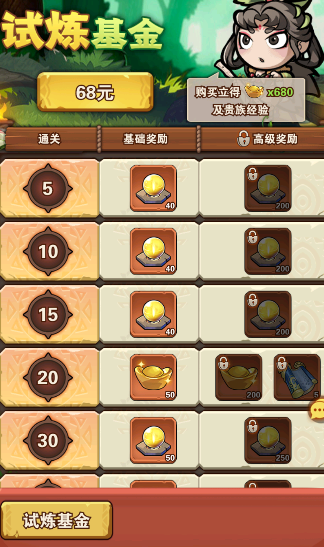 3,试炼之塔,可获取铜币进阶石和武将经验,闯关越高获取的材料越多,建议购买试炼基金,试炼基金送的材料以及招募卷和元宝还是很划算的