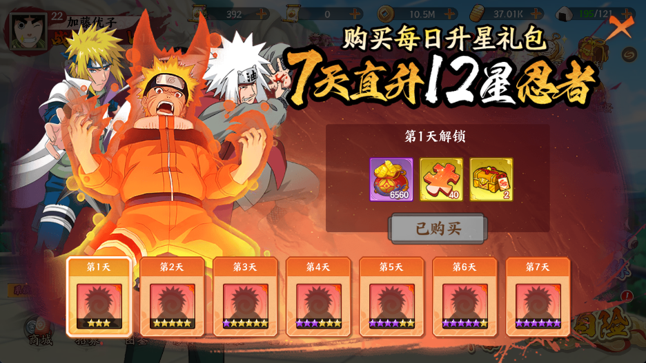 第一天有:元宝*6560、SSS万能碎片、SSS卡包三选一(自来也、波风水门、一尾鸣人)*2