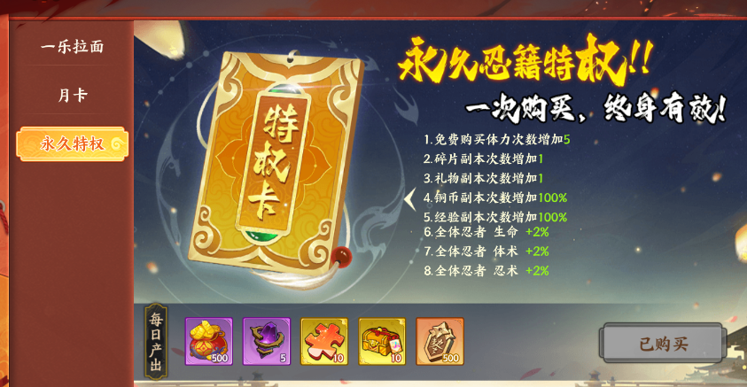 有属性加成以及每天领取大量道具(UR碎片宝箱、特权令),是深入体验游戏必备特权