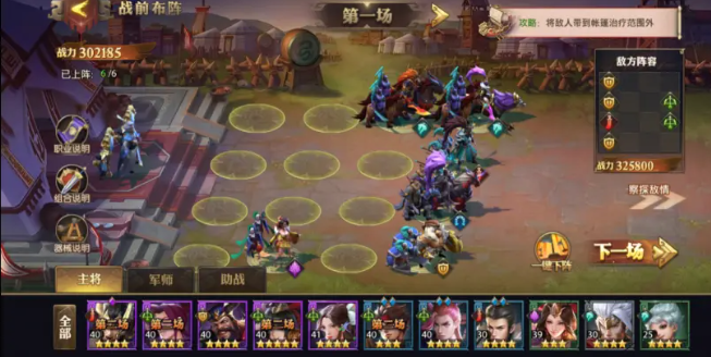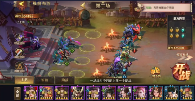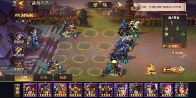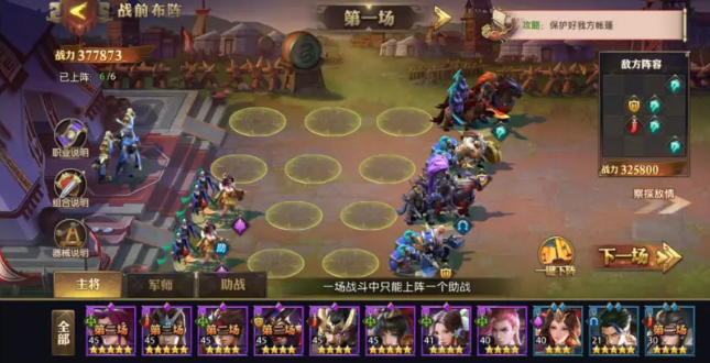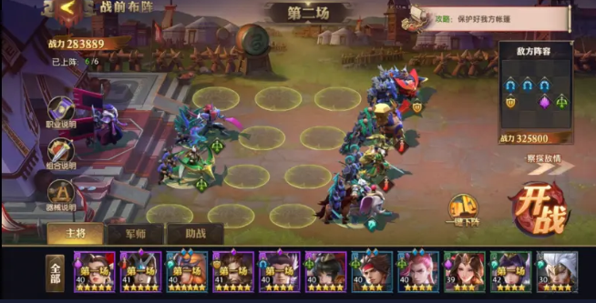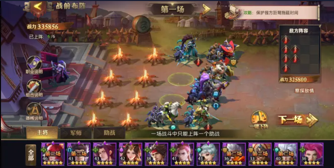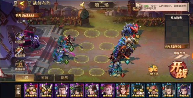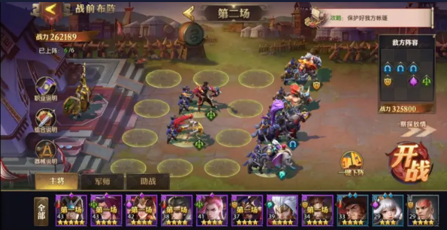 第三关敌方阵容比较单一己方也不要选什么花里胡哨的,分配战力、上阵传统阵容即可,要注意的是面对敌方多轻骑阵容时,要保护好己方输出主将,保证双C安全,阵容才能够稳定。
