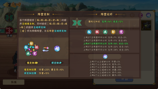 玩家需巧妙构建战斗阵容,依据不同战局灵活调配角色,凭借策略与绝技征服对手,享受烧脑且激爽的战斗快感。队伍中可以编入6名角色,角色有6种阵营和4种定位。阵营分为叛、影、联、觉、疾、叛和超;定位分为忍法、体术、抗压和医疗。各个阵营按照【叛>联>疾>影>觉>叛】的顺序互相强克制,同时按照【叛>影>联>觉>疾>叛】的顺序互相弱克制【超】作为特殊阵营,与五阵营互相弱克制。同时会根据上阵中同阵营的英雄数量获得传说之力的加成。可以根据你队伍中6名角色的定位设置合理的阵法。