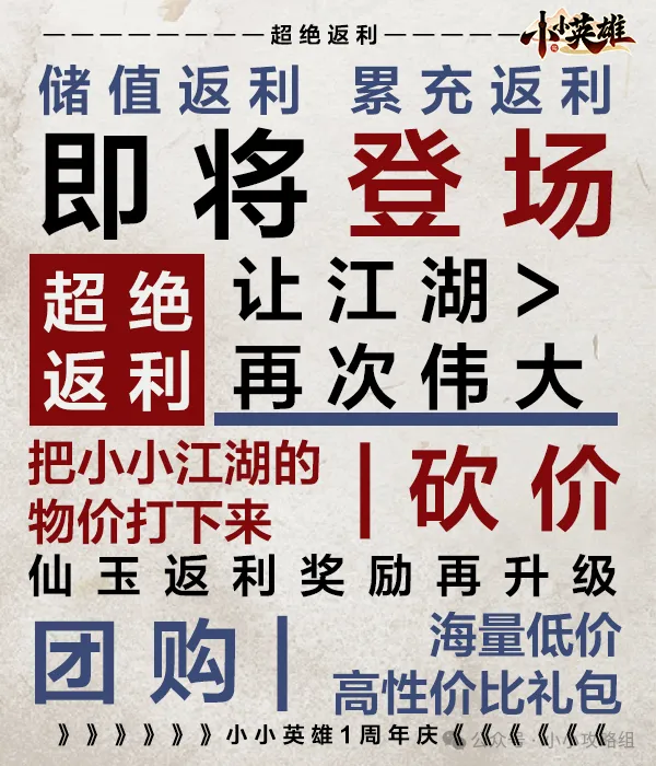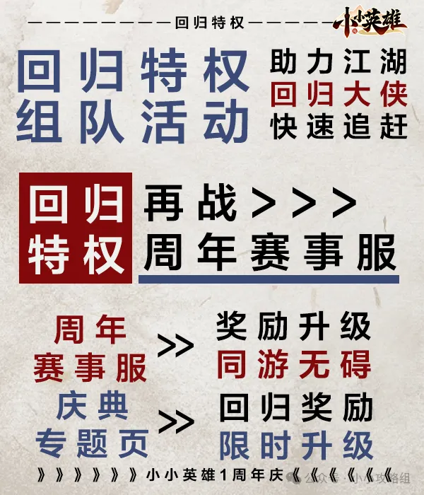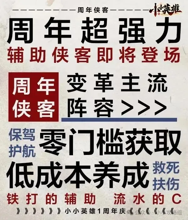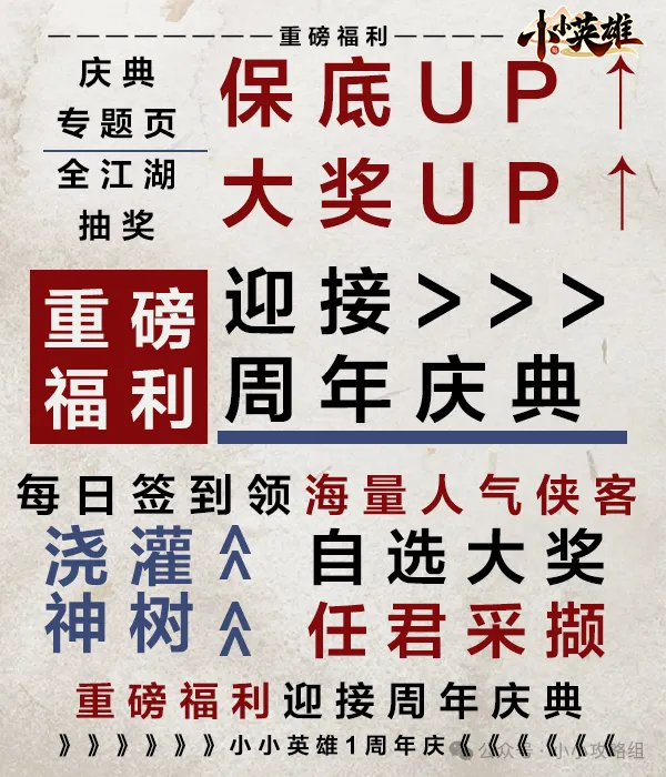 小小英雄万众期盼的周年庆活动,终于在昨天初见眉目!全新活动巅峰赛事,签到即可领取大量侠客,自选大奖,此外还有全新辅助侠客登场……超多新内容!知道有些大侠并没有仔细看官方海报,所以本期给各位简单的分析一波!
