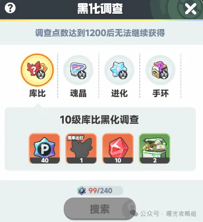 通过完成日常情报可获取红矿、橙色库比信物等道具,还能获取不同的调查点数(具体任务品质紫15、蓝12、绿10)来激活黑化调查,黑化调查可以获取自选橙库比、魂晶、进化材料、随机手环部件等道具(根据自己的需求选择任务)